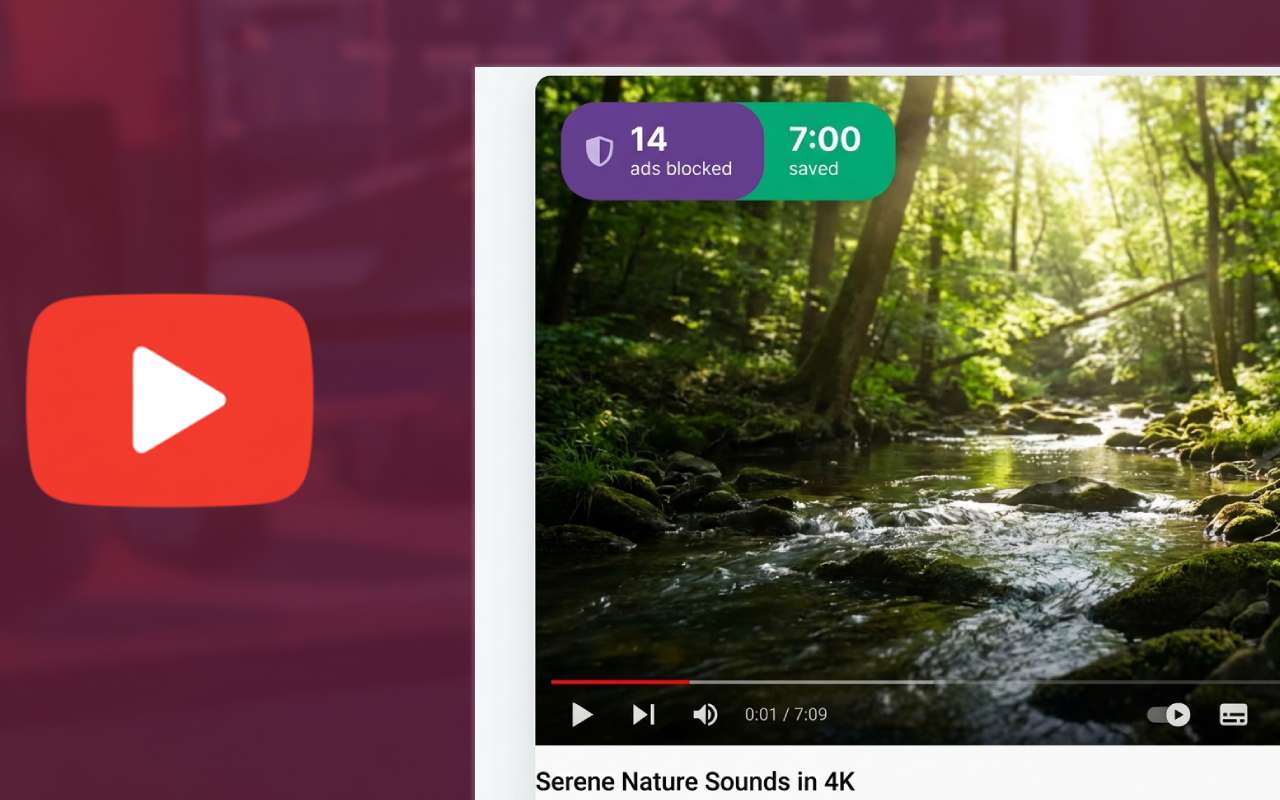 - Blocks pre-roll, mid-roll, and banner ads on YouTube