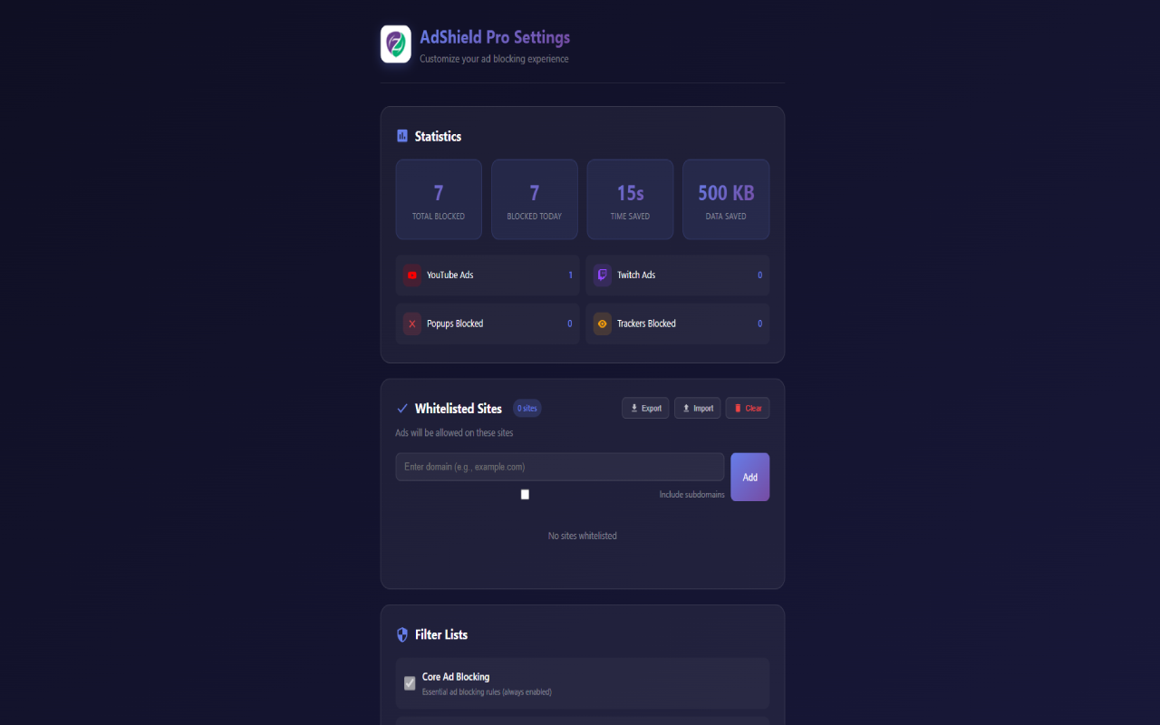 - Statistics Dashboard: Track total ads blocked, time saved, and data saved